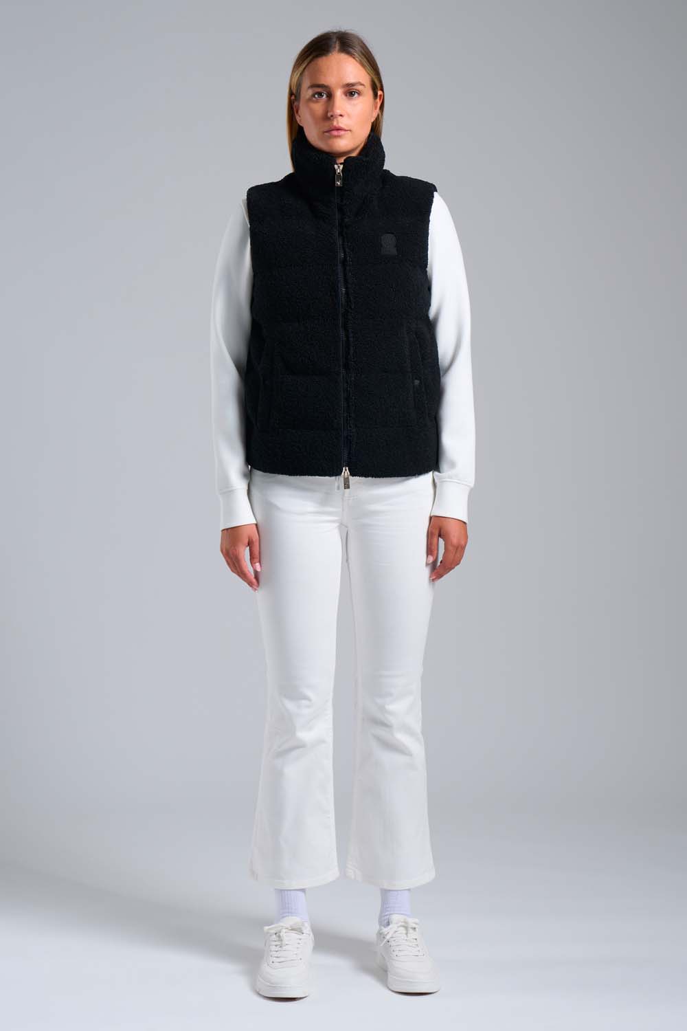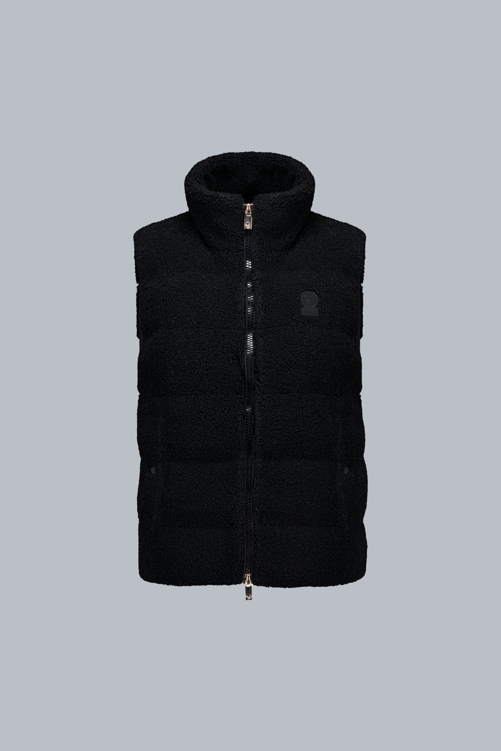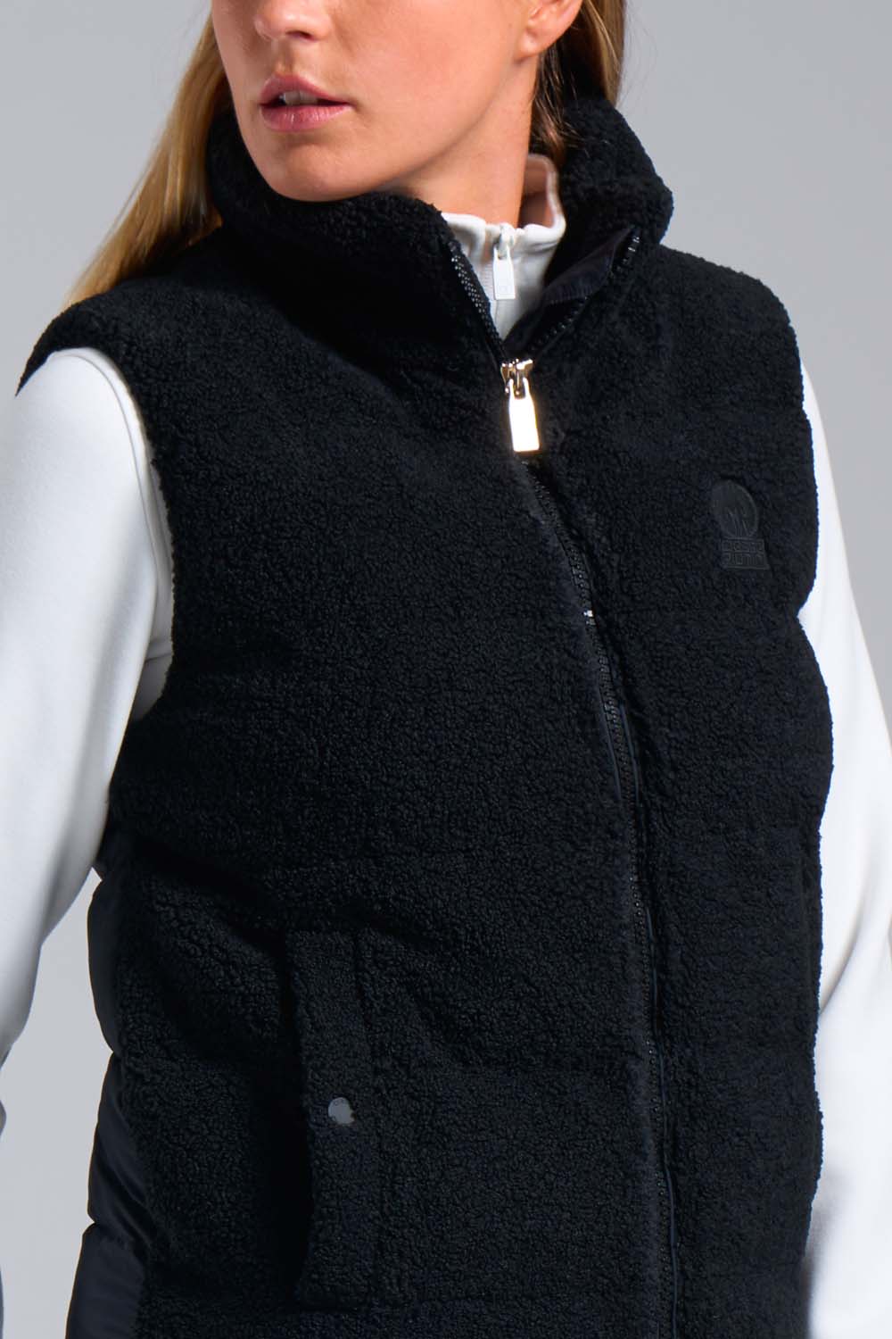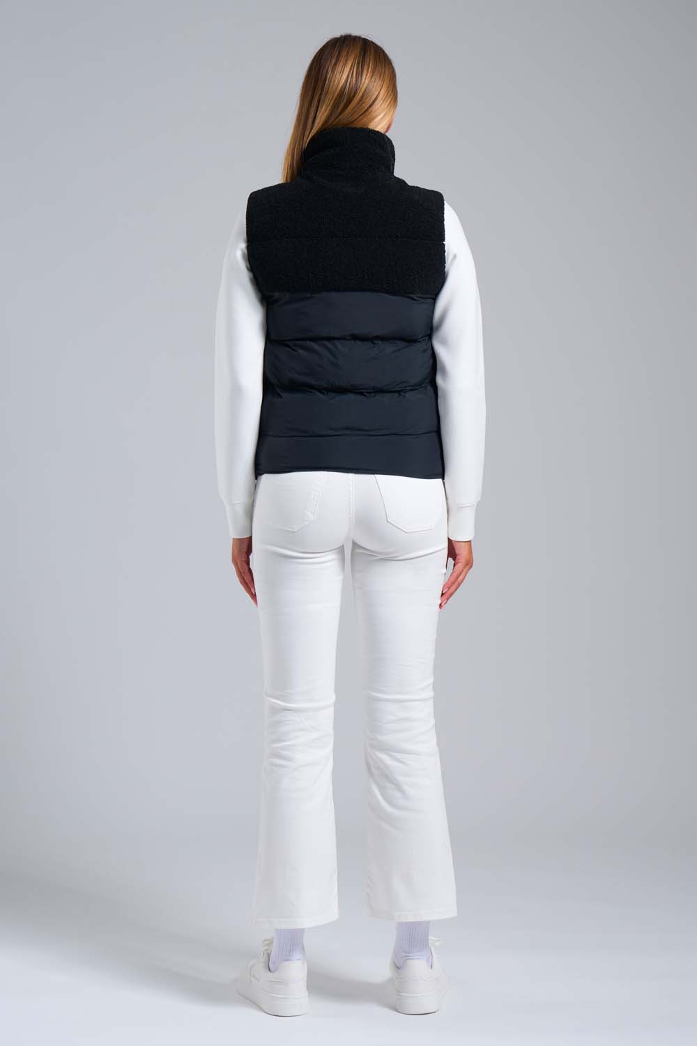 Gilet ibrido da donna in colore nero, imbottito in eco down dalla silhouette trapuntata che combina tessuto semilucido dall’aspetto pelle e morbidi pannelli in teddy per una sensazione di comfort.