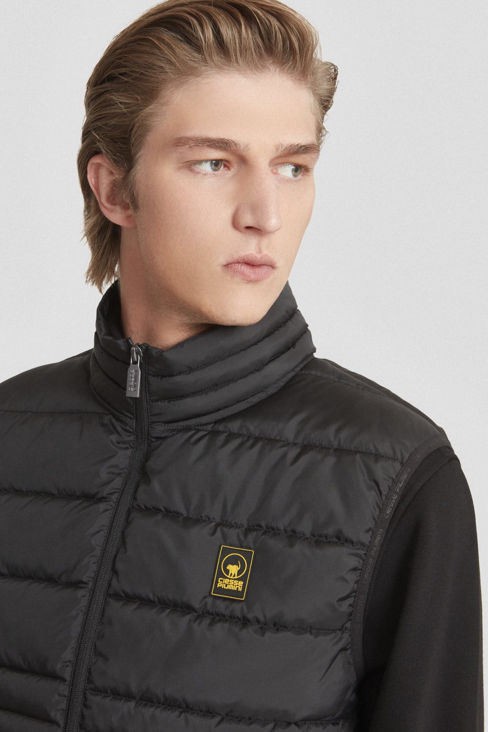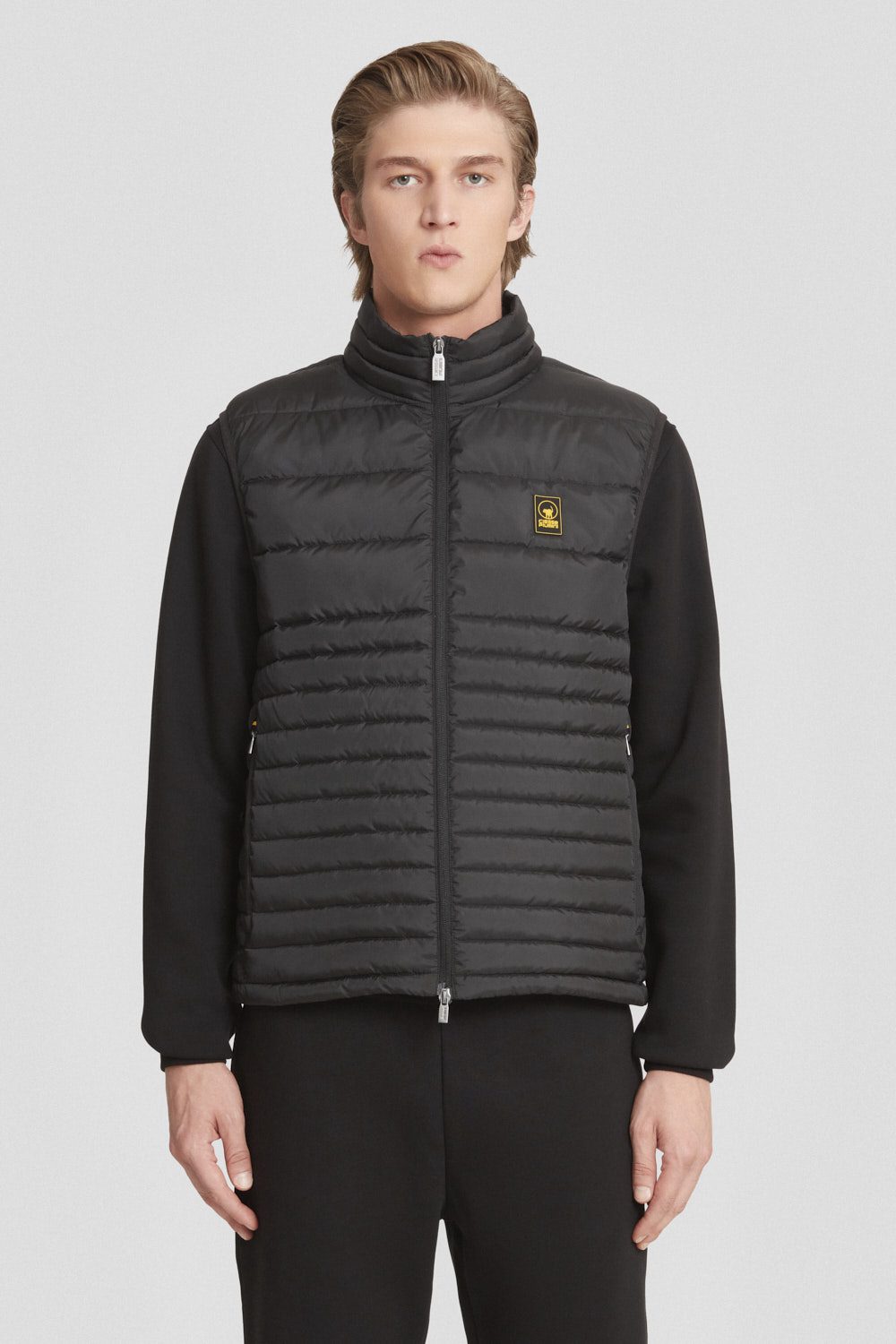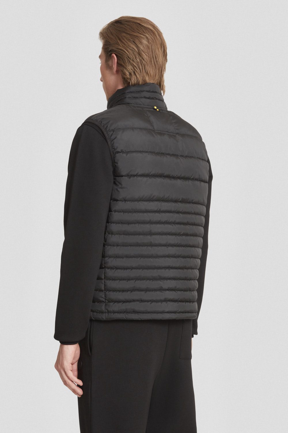 Gilet nera trapuntato realizzato in tessuto micro ripstop riciclato, leggero e attento all’ambiente.