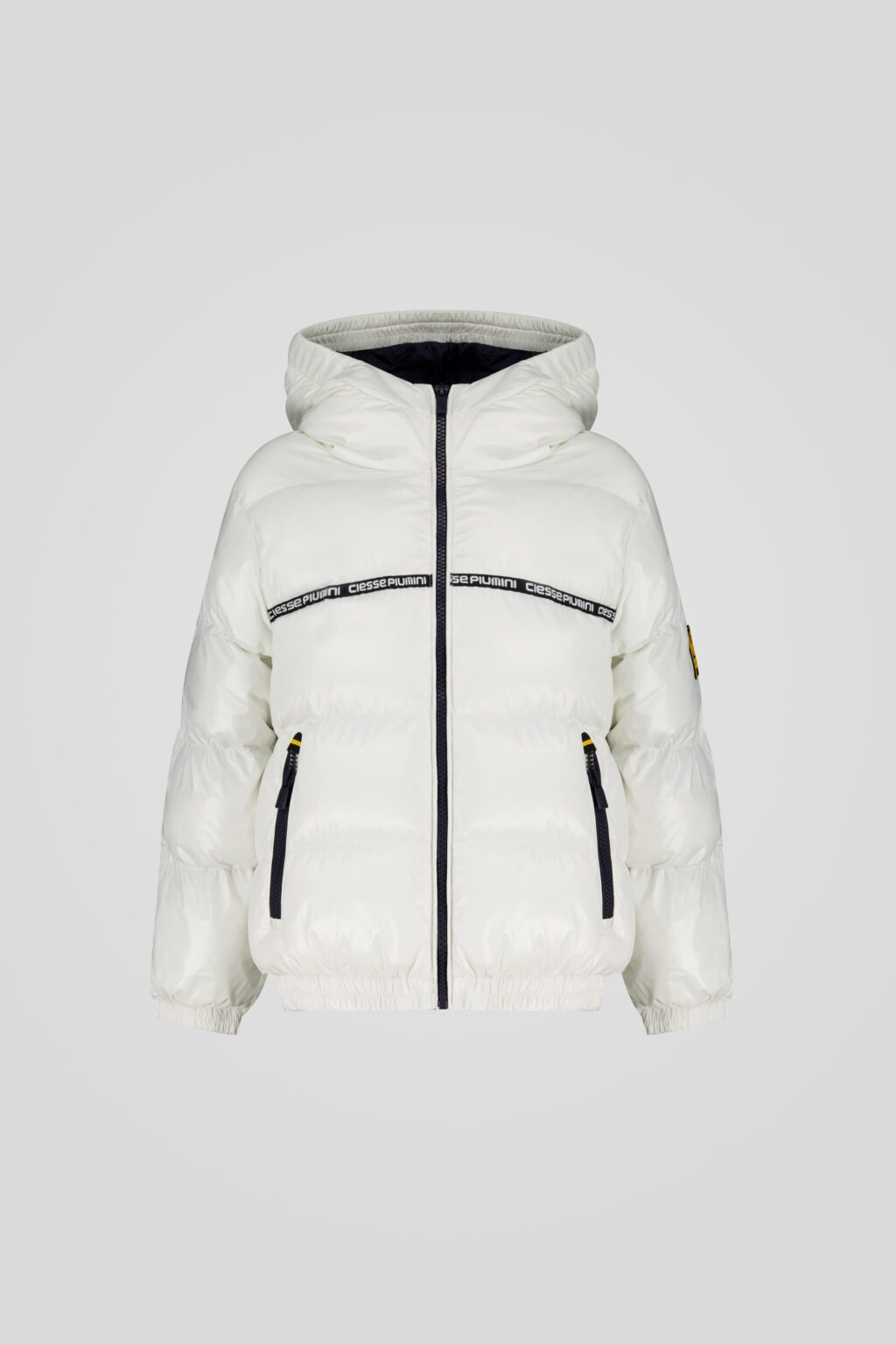 Completano il capo la vestibilità regular, le due tasche laterali con zip e patch Ciesse Piumini in rubber giallo e nero applicato sulla manica sinistra.