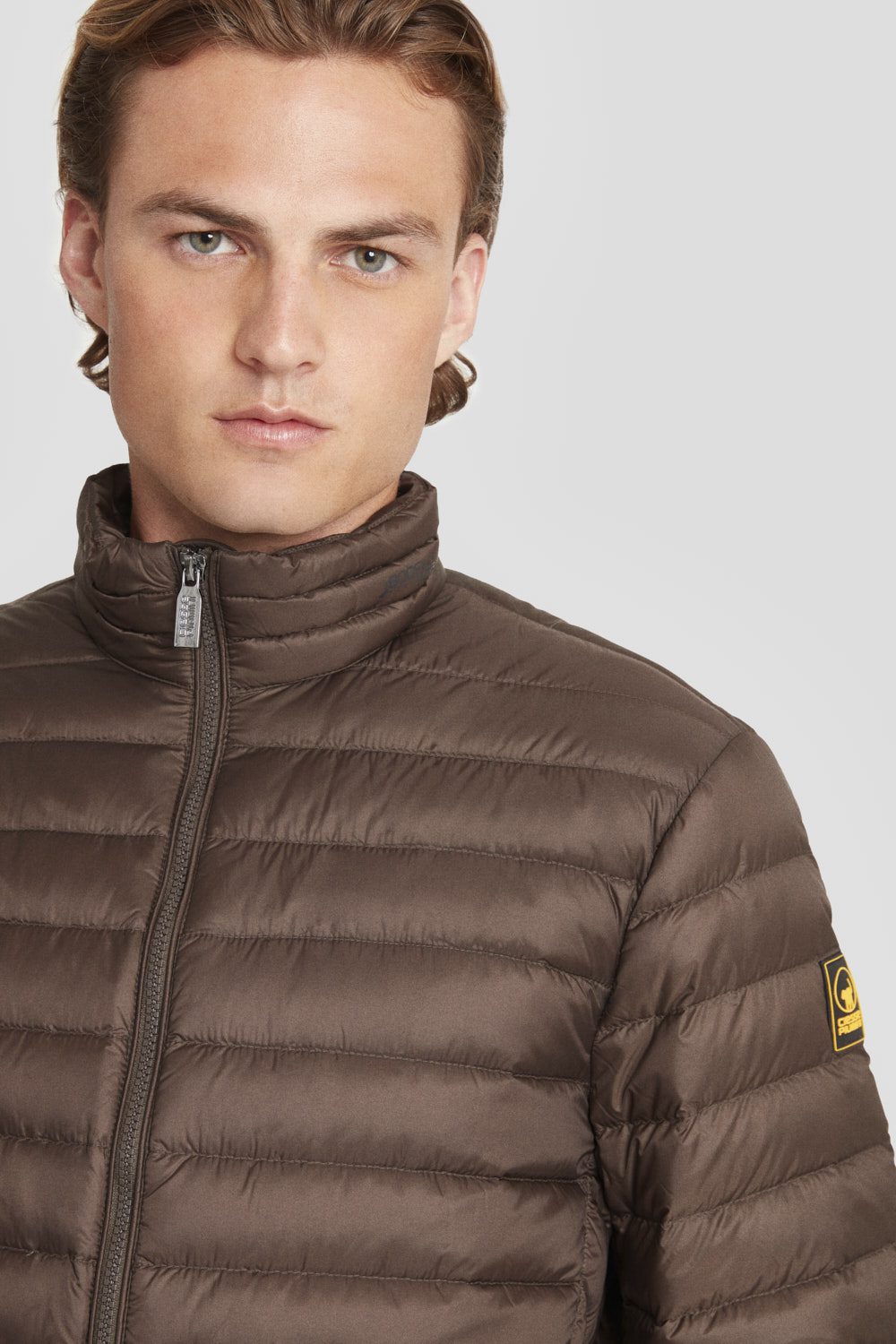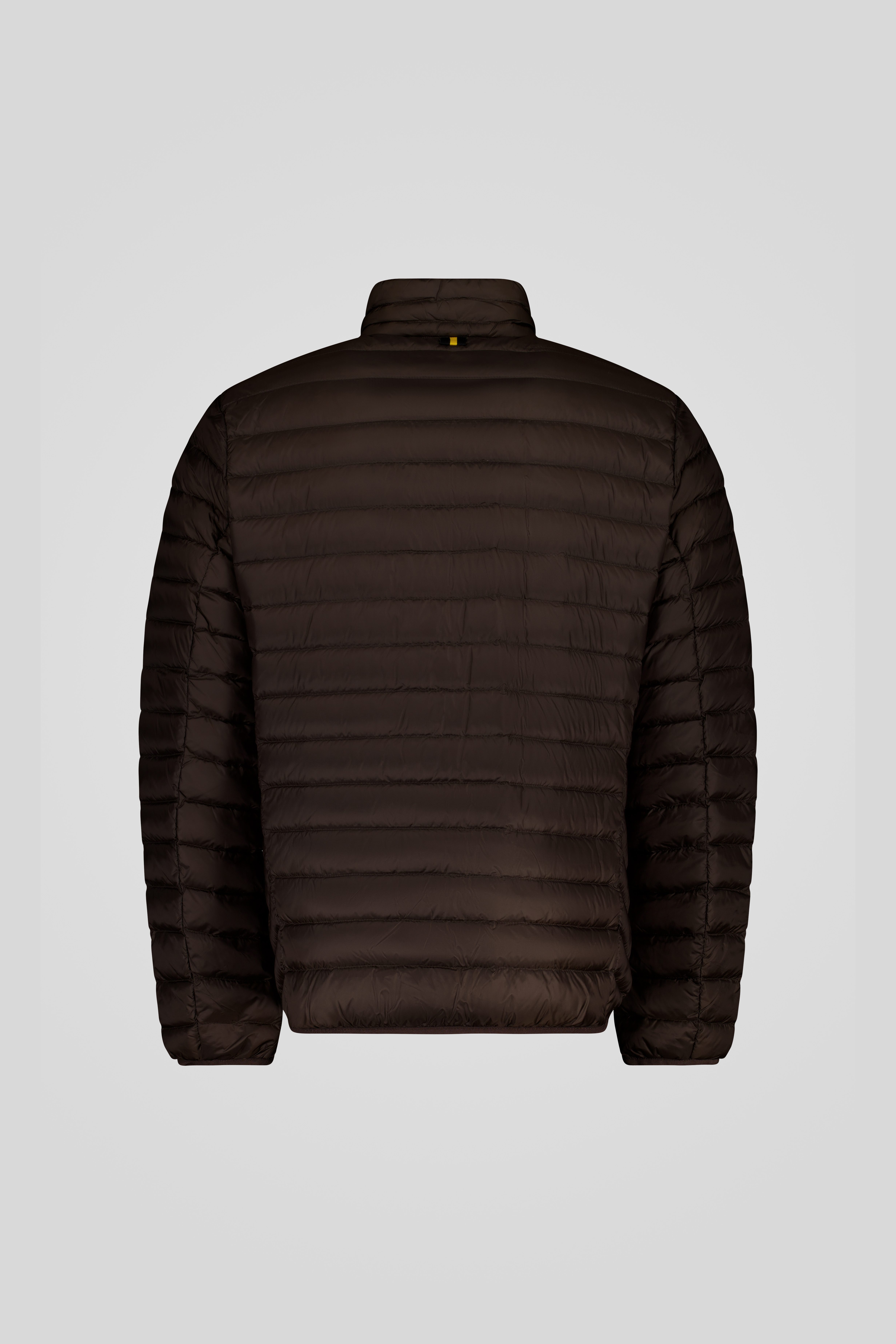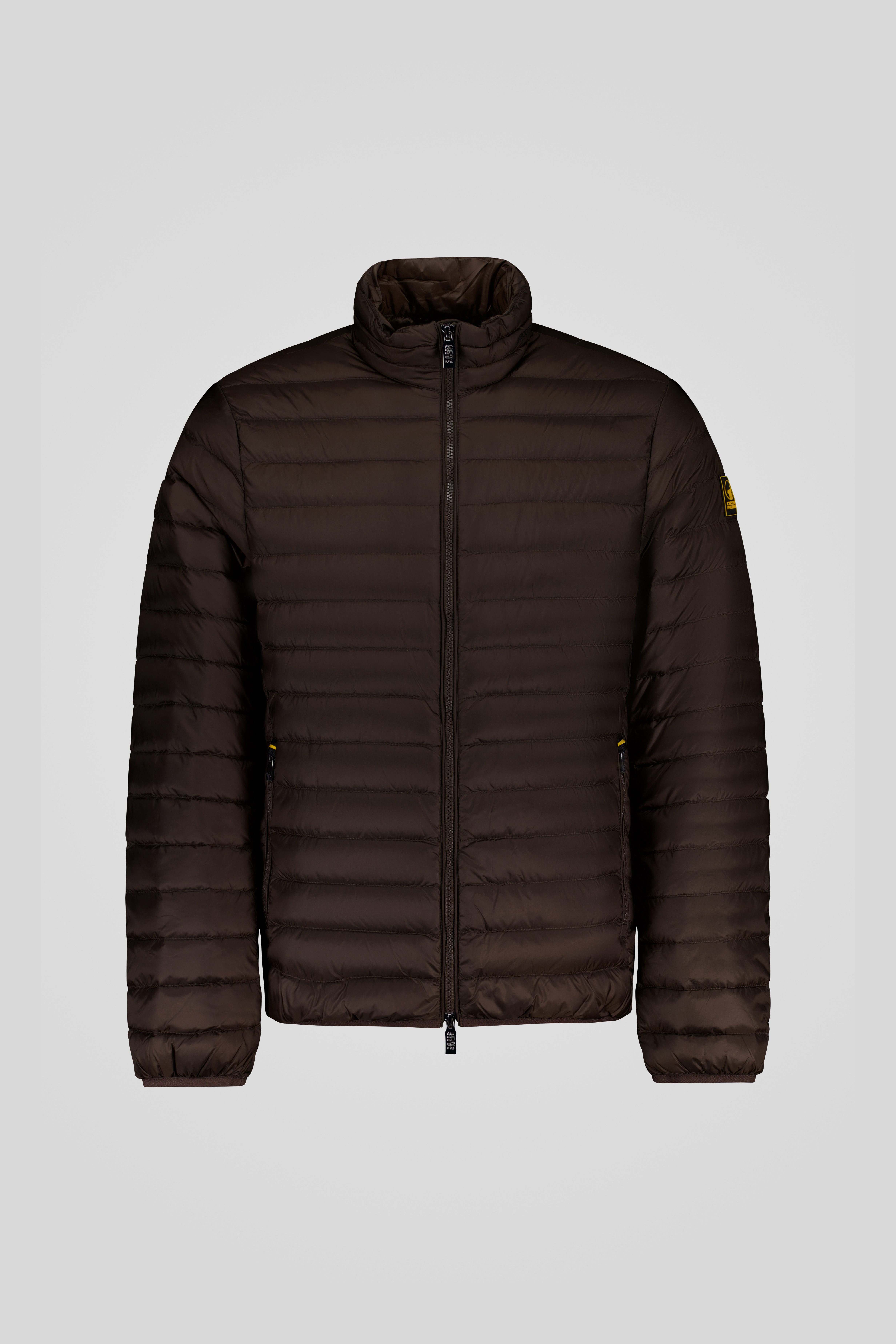 Piumino marrone 100 grammi, dal taglio essenziale e trasversale, senza cappuccio e con trapunta a spina di pesce sui fianchi per migliorare la vestibilità.