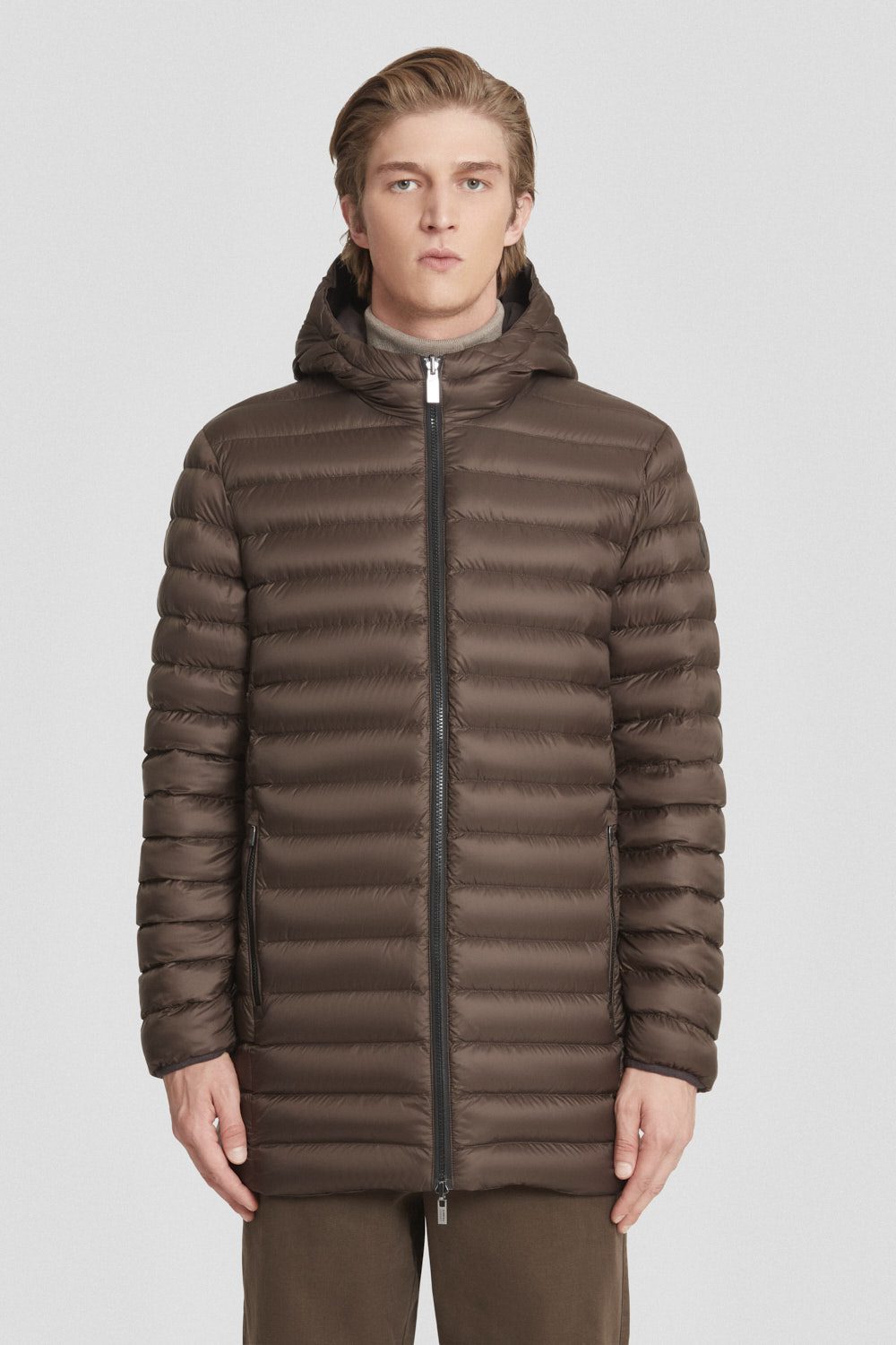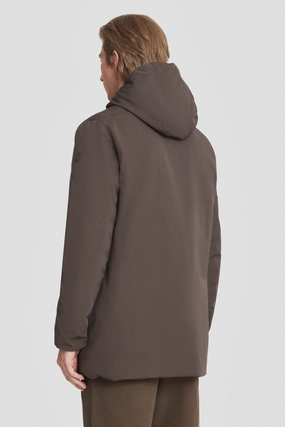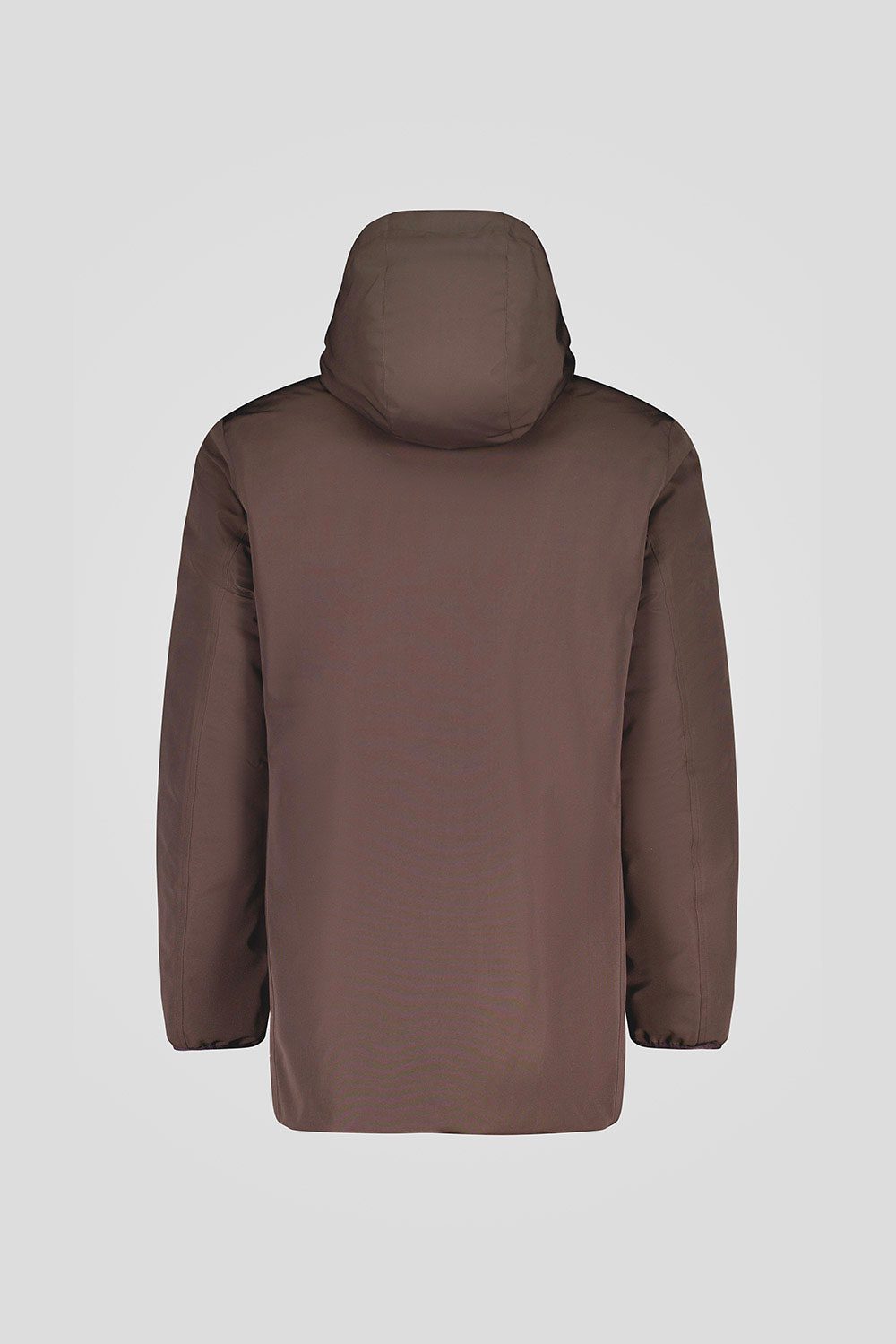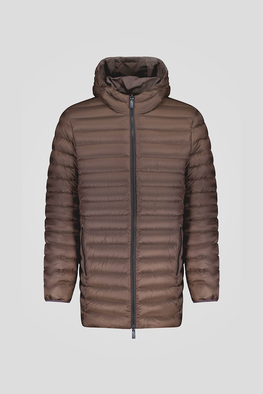Piumino lungo marrone reversibile imbottito in vera piuma 800 fill power, con esterno in tessuto liscio poly taslan trattato water repellent e interno trapuntato in nylon ciré opaco.